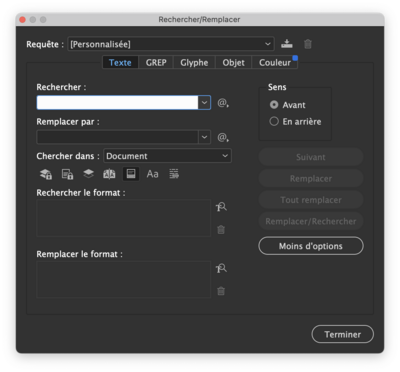 ⌘+F (mac) ou CTRL+F (pc) ouvre le panneau de rechercher remplacer sur indesign. Ce raccourci est valable sur toute votre machine. Vous pouvez donc rechercher sur des pages web, sur des documents pdf de la même manière. — (source)