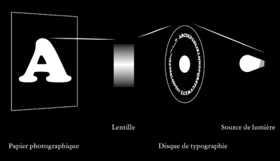 Schéma de fonctionnement d’une photocomposition, la distance de la lentille du papier permet des jeux de flous et la variation de la taille des lettres