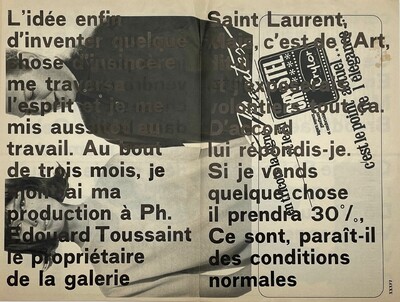 Texte : "Moi aussi je me suis demandé si je ne pouvais pas vendre quelque chose et réussir dans la vie. Cela fait un moment déjà que je ne suis bon à rien. Je suis âgé de quarante ans... L'idée enfin d'inventer quelque chose d'insincère me traversa l'esprit et je me mis aussitôt au travail. Au bout de trois mois, je montrai ma production à Ph. Edouard Toussaint le propriétaire de la Galerie Saint-Laurent. Mais c'est de l'art, dit-il, et j'exposerais volontiers tout ça. D'accord, lui répondis-je. Si je vends quelque chose il prendra 30%. Ce sont paraît-il des conditions normales. Certaines galeries prenant 75%. Ce que c'est ? En fait, des objets [...].