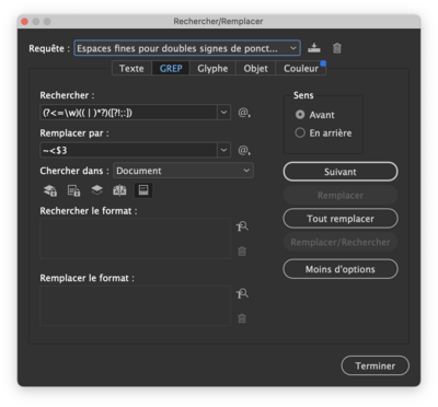 ⌘+F (mac) ou CTRL+F (pc) ouvre le panneau de rechercher remplacer sur indesign. Ce raccourci est valable sur toute votre machine. Vous pouvez donc rechercher sur des pages web, sur des documents pdf de la même manière. — (source)